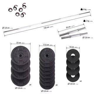 ✅ Une barre longue de 155 cm (7,8 kg) : idéale pour les exercices polyarticulaires comme le développé couché, le squat ou le soulevé de terre.
